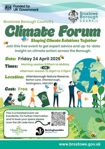 Following the success of the Council's first Climate Forum in 2025, plans are now confirmed for this year's event, which has been funded by UKSPF. Taking place at Attenborough Nature Reserve Centre on Friday 24 April.